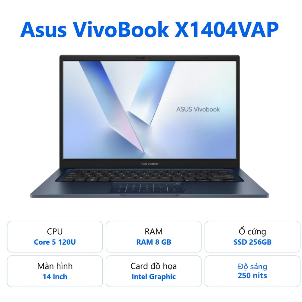 Nếu bạn đang tìm kiếm một chiếc laptop văn phòng đáp ứng tiêu chí nhỏ gọn, bền bỉ và sở hữu hiệu năng tốt thì Asus VivoBook X1404VAP | Core 5-120U 8GB 256GB 14'' FHD Win 11 Blue chính là cái tên không thể bỏ qua. Với sự góp mặt của bộ vi xử lý Intel Core 5 dòng Series 1 tiên tiến, chiếc máy này sẽ là người bạn đồng hành tin cậy cho sinh viên và nhân viên công sở. Sản phẩm hiện đang sẵn hàng tại T&T Center với tình trạng mới 100% Full VAT.